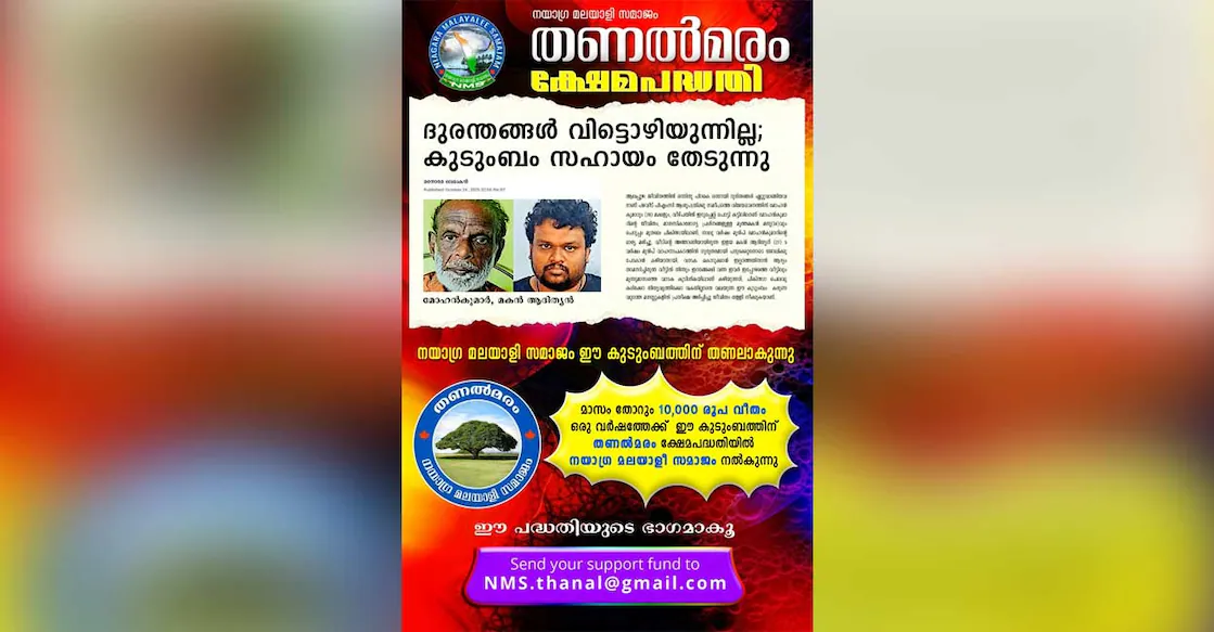 ഈ ദുരിത സാഹചര്യത്തിലാണ് നയാഗ്ര മലയാളി സമാജം സഹായഹസ്തവുമായി എത്തുന്നത്. മാസംതോറും 10,000 രൂപ വീതം ഒരു വർഷത്തേക്ക് നൽകുന്ന ഈ സഹായം, കുടുംബത്തിന് വലിയ ആശ്വാസമാകും. നയാഗ്ര മലയാളി സമാജത്തിന്റെ ഈ മഹത്തായ പദ്ധതിയിൽ പങ്കാളികളാകാൻ ആഗ്രഹിക്കുന്നവർക്ക് NMS.thanal@gmail.com എന്ന ഇമെയിൽ വിലാസത്തിൽ ബന്ധപ്പെടാവുന്നതാണ്.