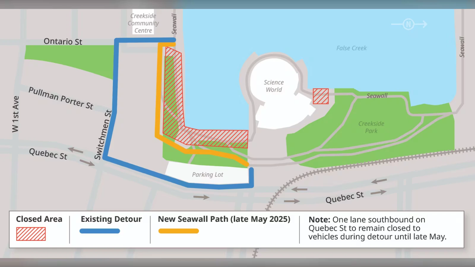 ഫെബ്രുവരിയിൽ ഘടനാപരമായ പ്രശ്നങ്ങൾ കണ്ടെത്തിയതിനെ തുടർന്ന് അനിശ്ചിതകാലത്തേക്ക് അടച്ചിട്ട വാൻകൂവറിലെ സയൻസ് വേൾഡിന് സമീപമുള്ള സീവാളിന്റെ ഭാഗത്തിന് ചുറ്റും ഒരു പുതിയ താൽക്കാലിക പാത നിർമ്മിച്ചുവരുന്നു. ഈ പാത മെയ് മാസം അവസാനത്തോടെ തുറക്കുമെന്നാണ് പ്രതീക്ഷിക്കുന്നത്. എക്സ്പോ ഡെക്ക് വിഭാഗം അനിശ്ചിതകാലത്തേക്ക് അടച്ചതിനെ തുടർന്നാണ് ഈ നടപടി സ്വീകരിച്ചിരിക്കുന്നത്.
